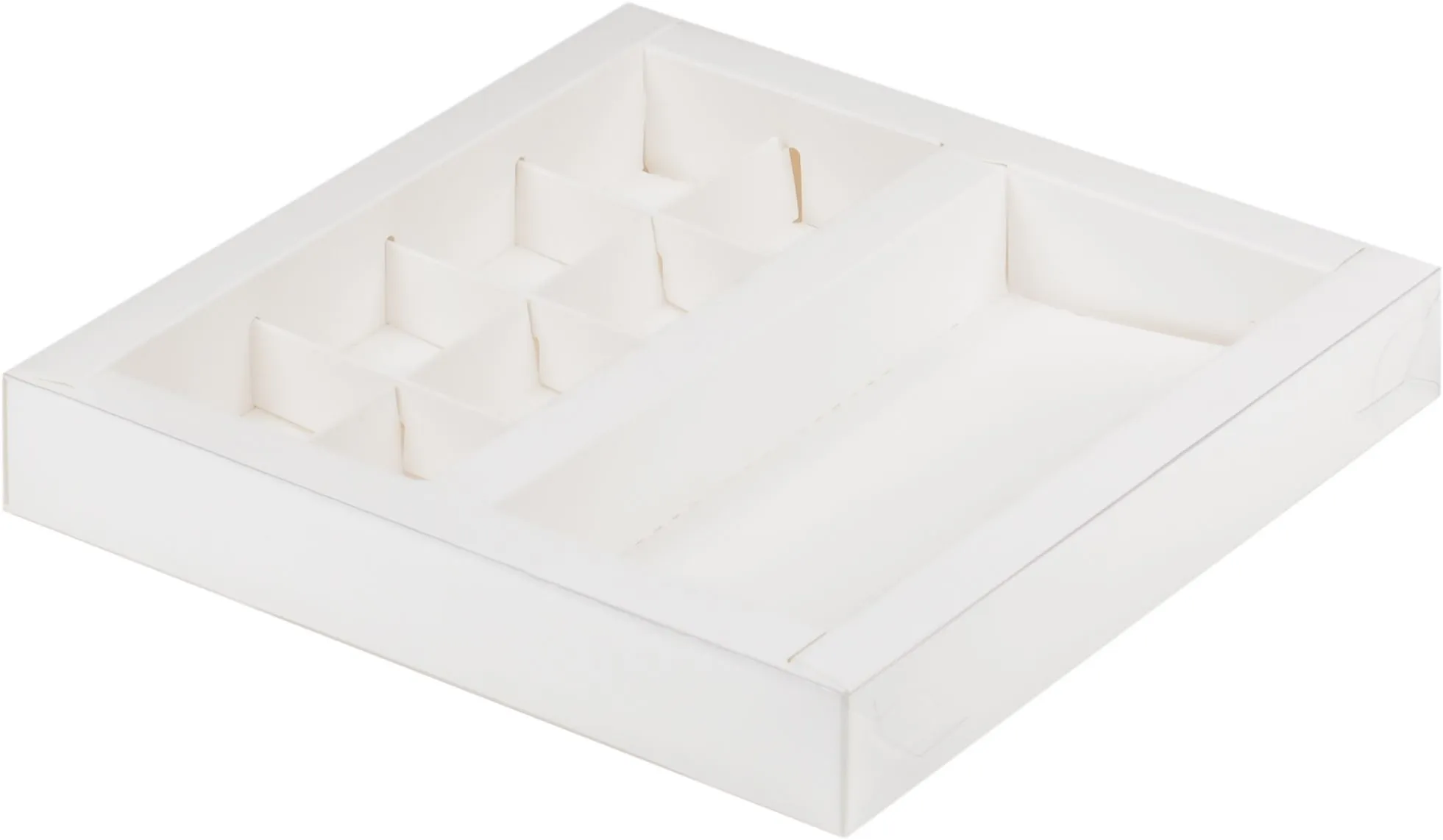 Коробка для 8 конфет 20х20х3 см и шоколадной плитки 16х8 см с пластиковой крышкой белая