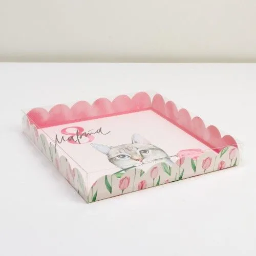 Коробка для кондитерских изделий с пластиковой крышкой "8 марта", 21х21х3 см